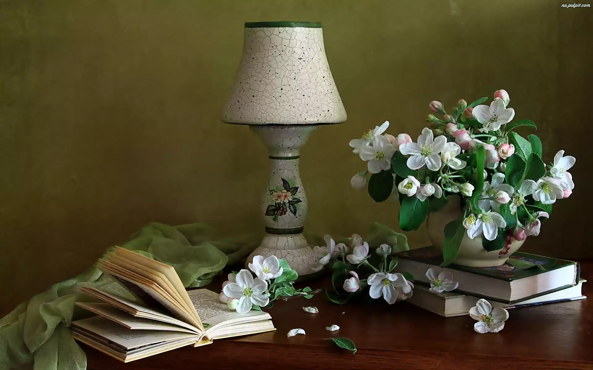 Kompozycja, Książki, Kwiaty, Lampka Na Pulpit