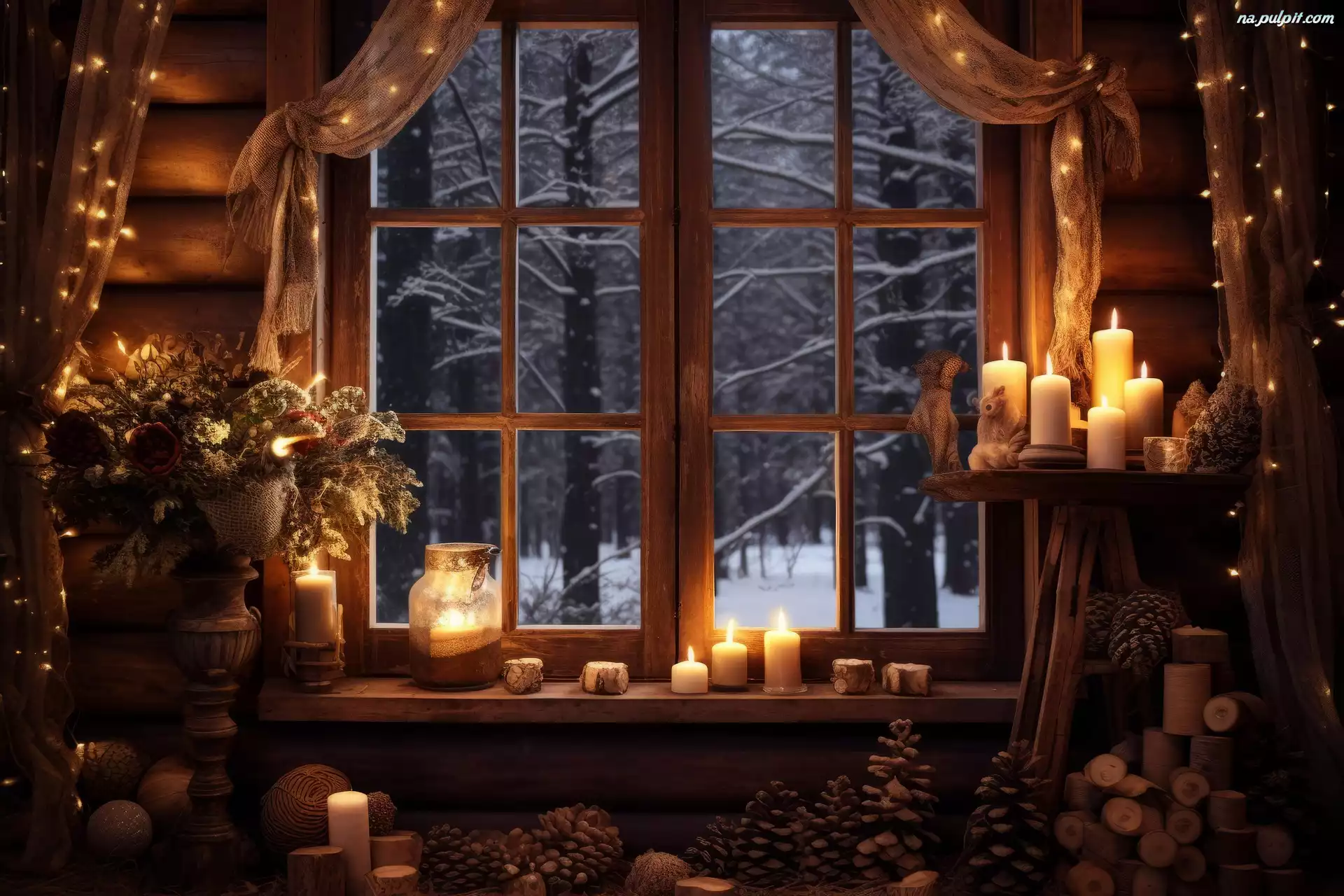 Bukiet, Świeczki, Parapet, Kompozycja, Okno, Zima, Światełka