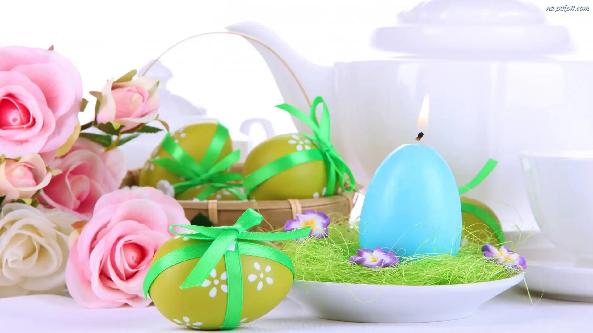 Świeca, Pisanki, Kosz, Kompozycja, Róże Na Pulpit