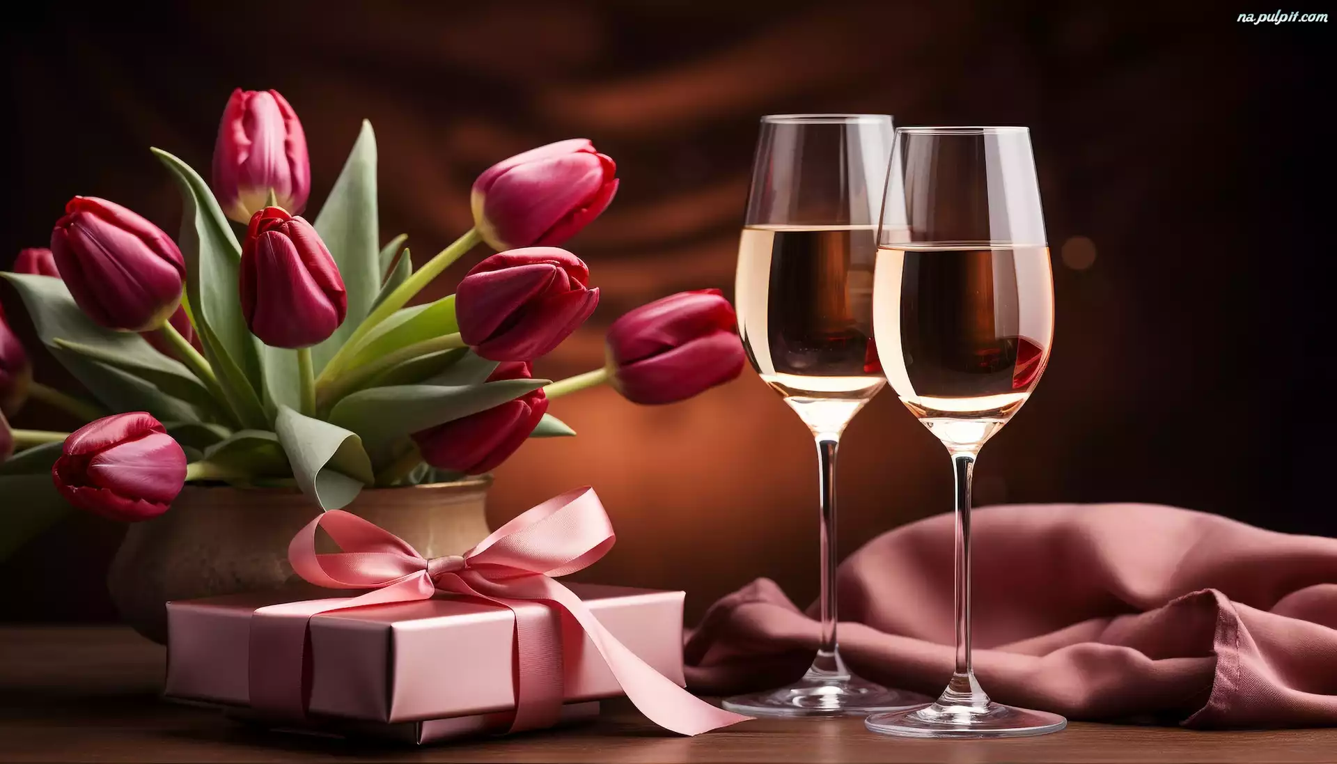 Materiał, Kieliszki, Prezent, Kompozycja, Kwiaty, Tulipany, Wino Na Pulpit
