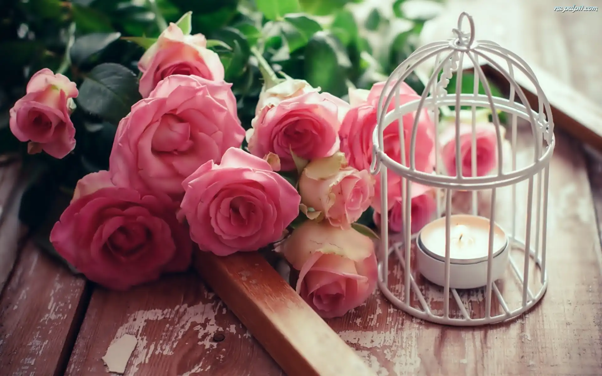 Świeca, Róże, Różowe, Kompozycja, Bukiet