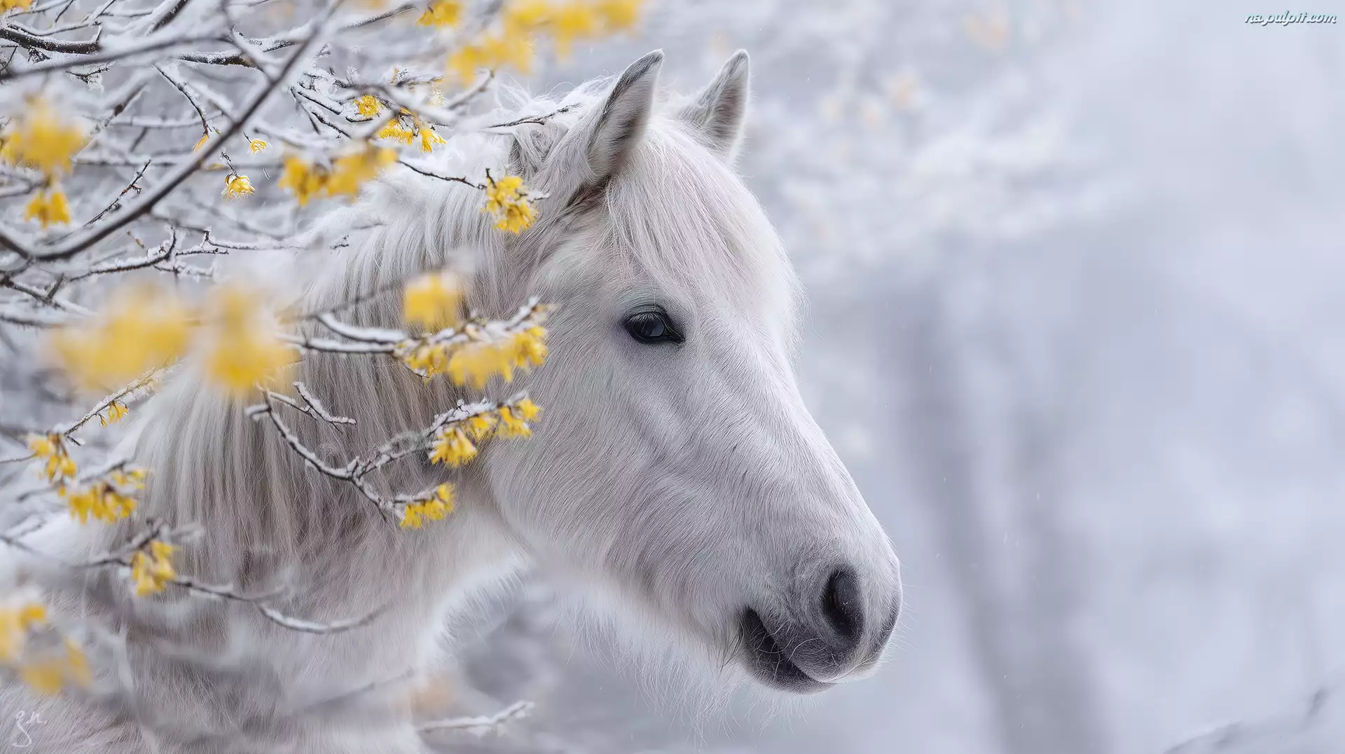 Biały, Koń, Gałązki, Grafika AI Na Pulpit
