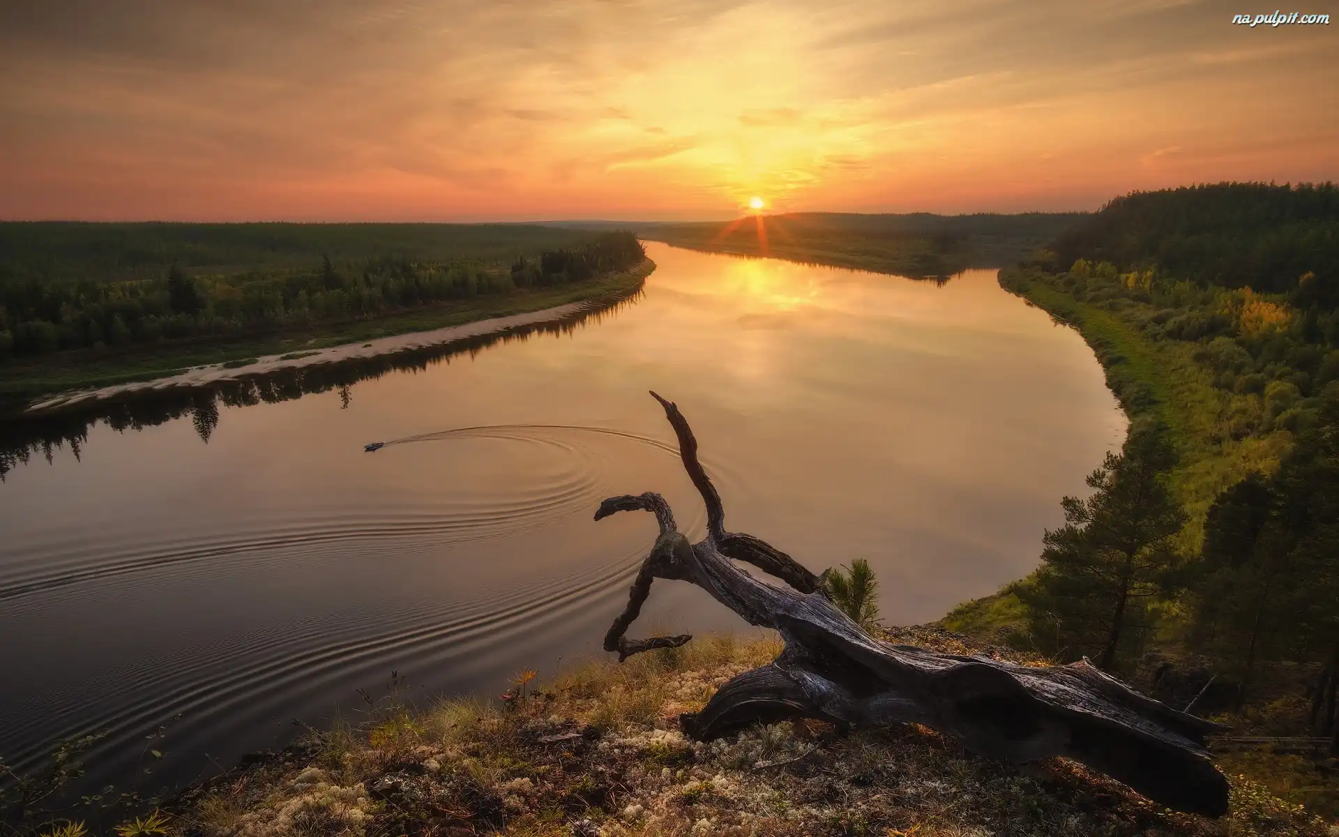 Konar, Rzeka Dolna Tunguzka, Łódka, Lasy, Obwód irkucki, Rosja, Drzewa, Zachód słońca, Suchy Na Pulpit |