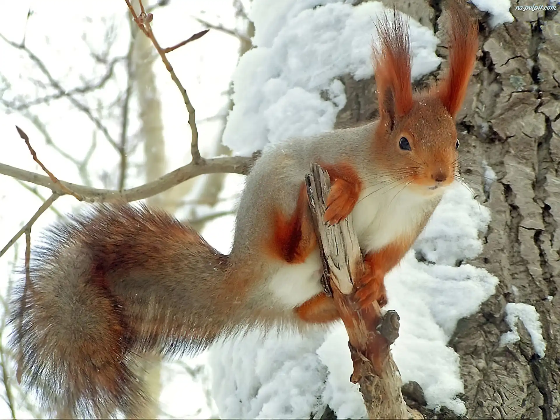 Śnieg, Drzewa, Konary, Wiewiórka Na Pulpit