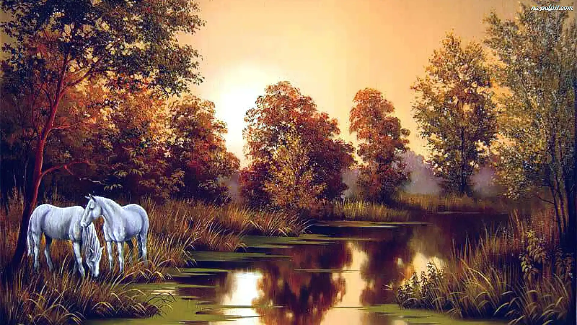 Konie, Drzewa, Jesień, Rzeka Na Pulpit