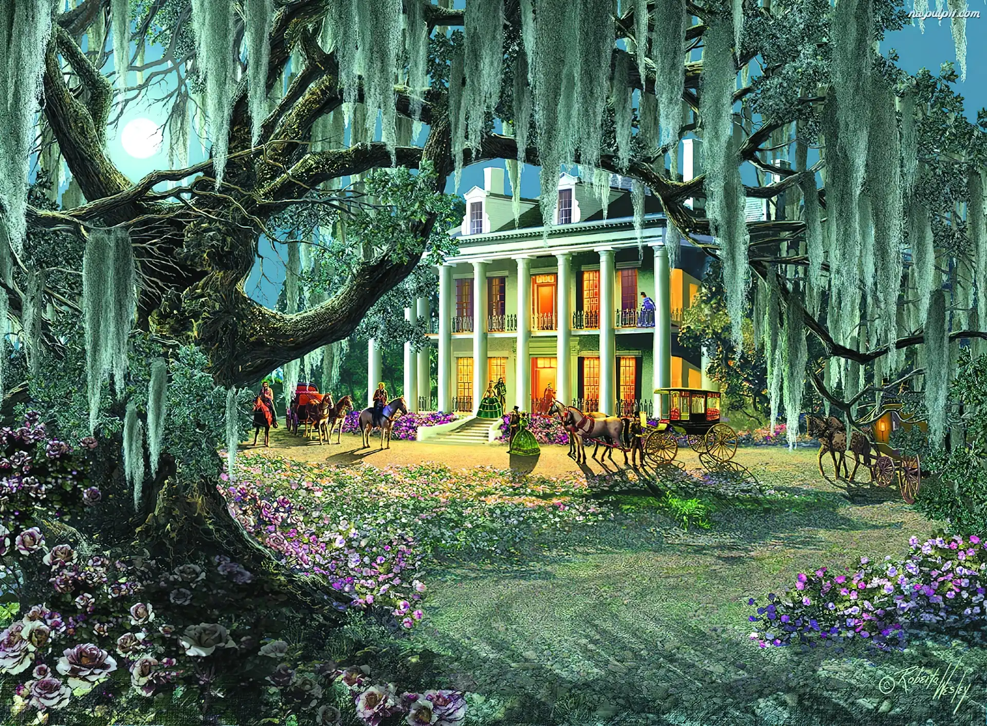 Konie, Drzewa, Pałac, Powozy Na Pulpit