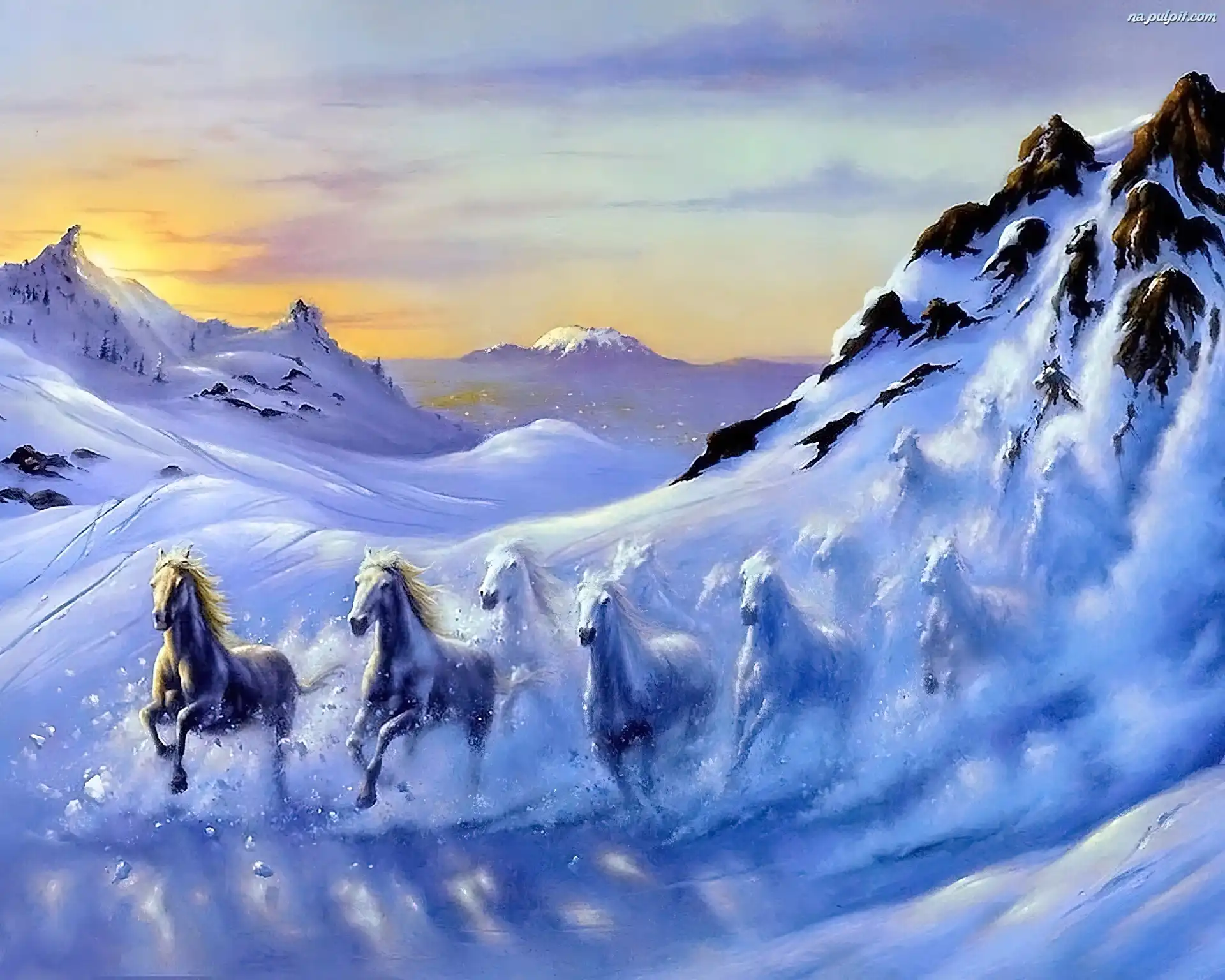 Konie, Góry, Śnieg, Zima, Pędzące Na Pulpit