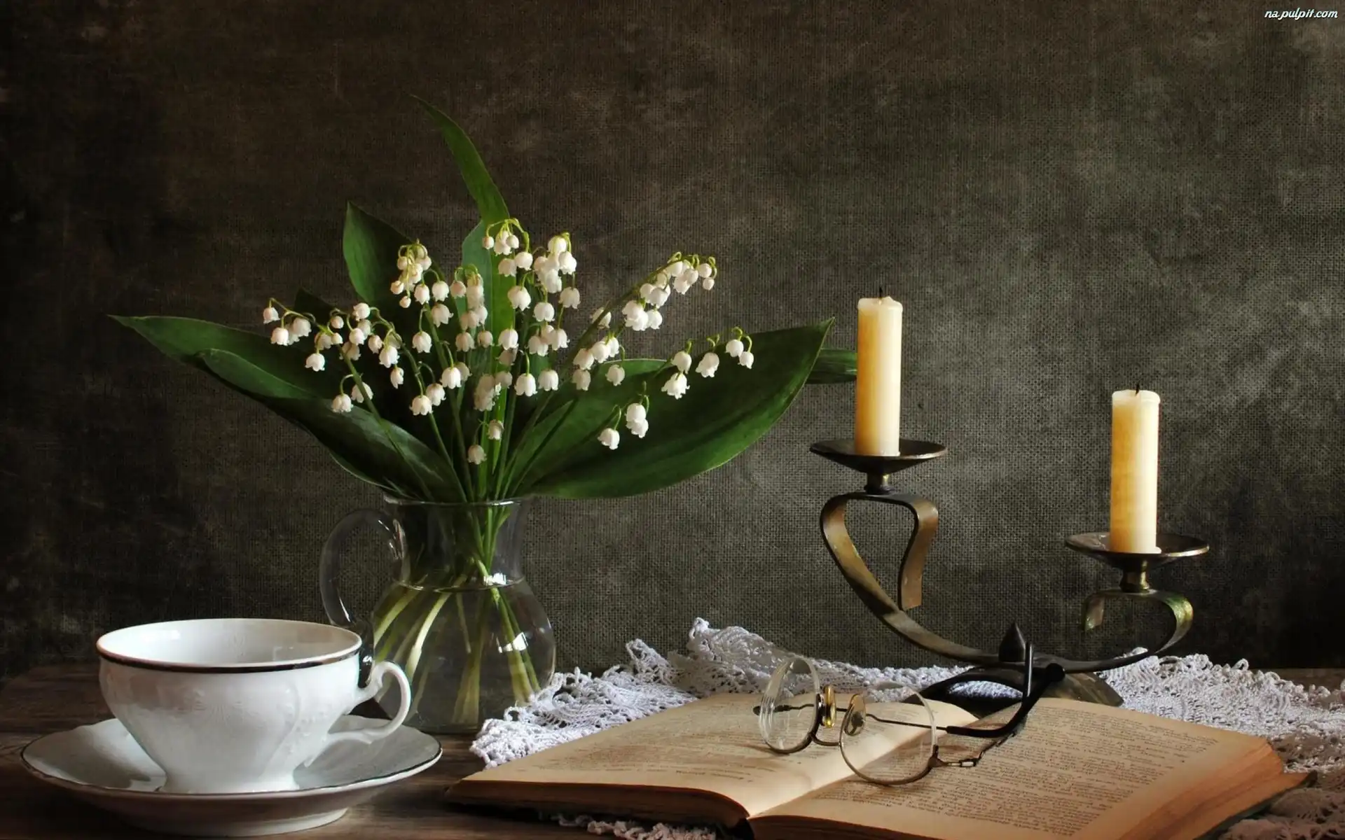Świecznik, Książka, Konwalie, Okulary Na Pulpit