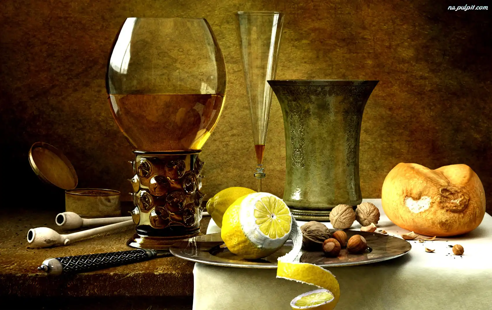 Bułka, Kornel, Ravaditis, Wino, Kieliszki, Orzechy, Obraz, Cytryna