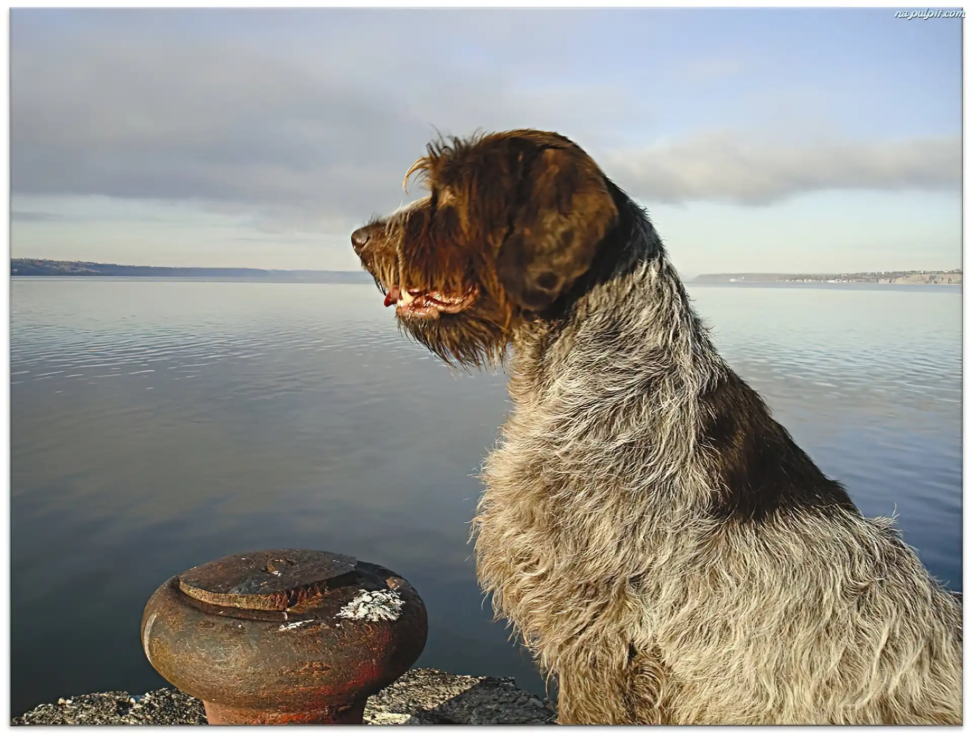 ośnieżony, Gryfon Korthalsa trwa, Gryfon Korthalsa, siedzący, wysoka Gryfon Korthalsa obroża, Gryfon Korthalsa, pomarańczowa Gryfon Korthalsa, woda