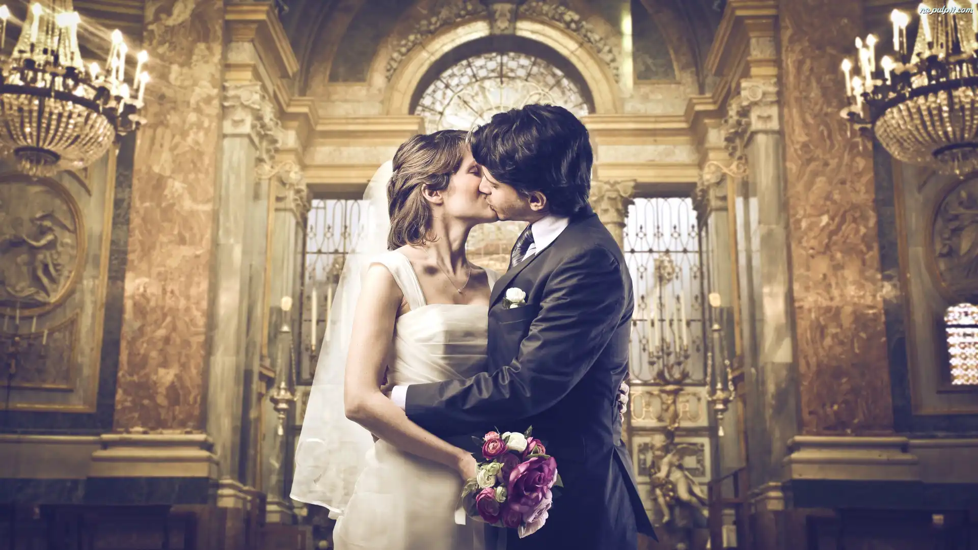 Kościół, Mężczyzna, Kobieta, Nowożeńcy, Pocałunek