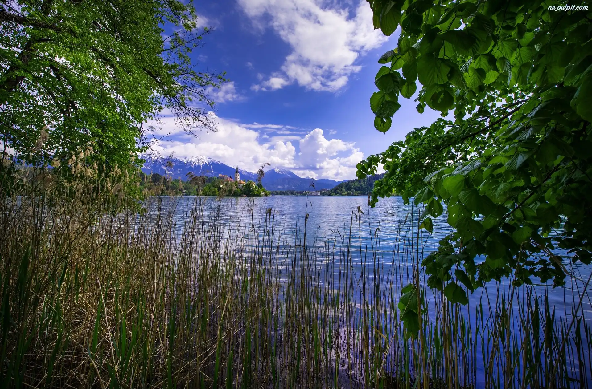 Słowenia, Drzewa, Trzciny, Wyspa Blejski Otok, Jezioro Bled, Kościół Na Pulpit