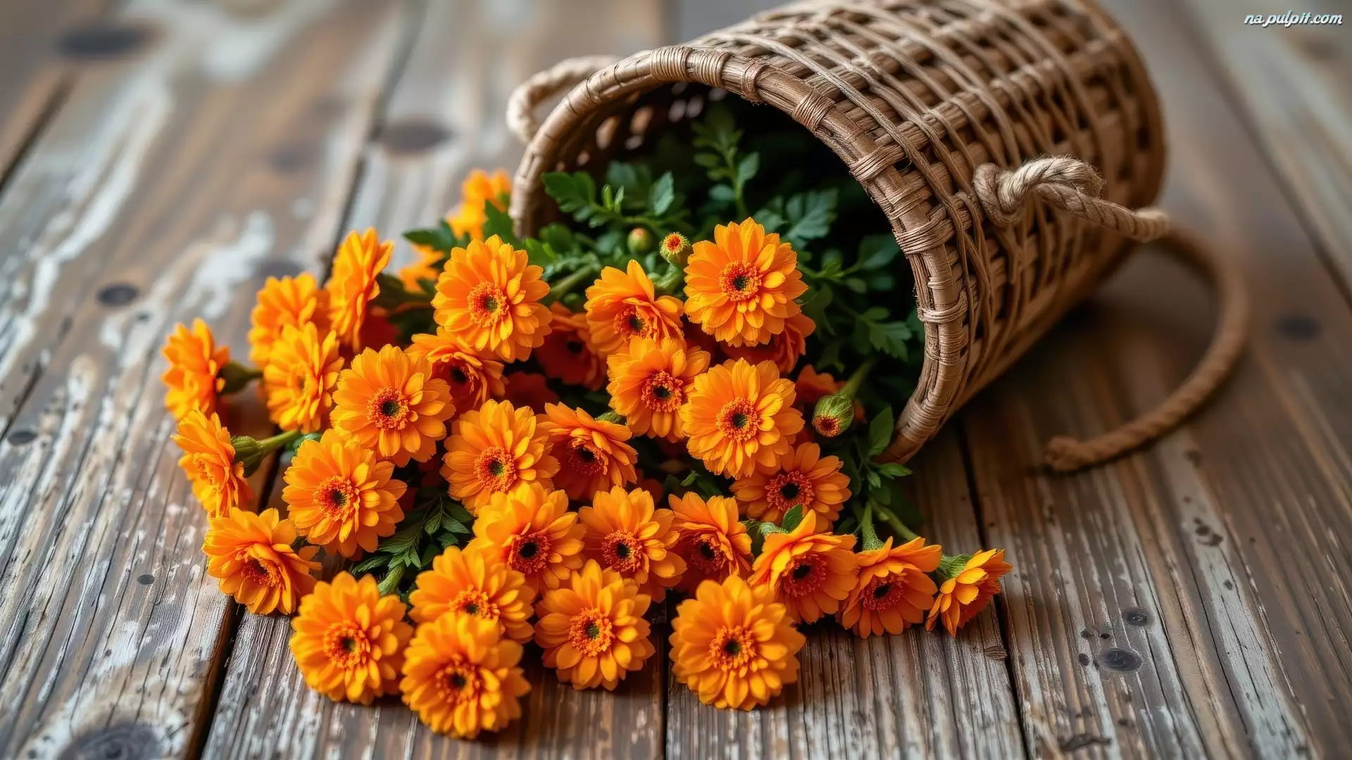 Wiklinowy, Pomarańczowe, Leżący, Kosz, Kwiaty, Deski