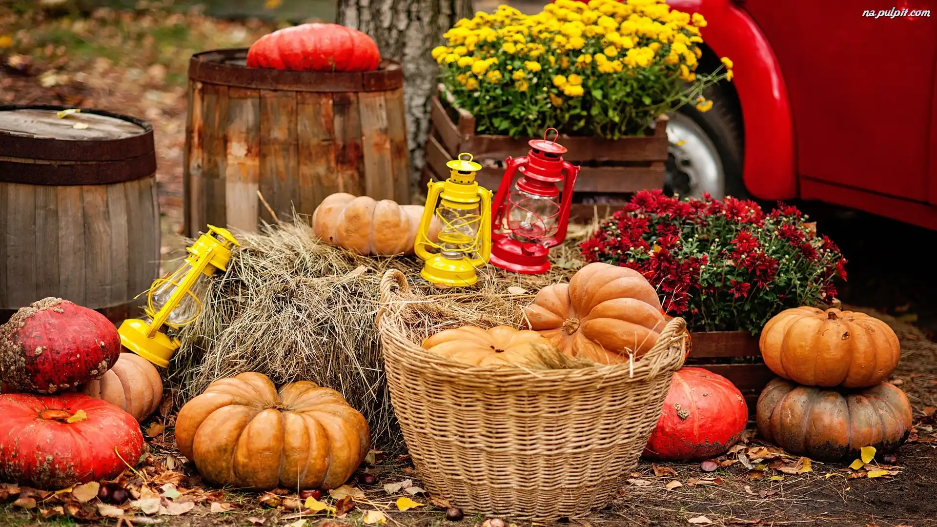 Kosz, Siano, Beczki, Chryzantemy, Dynie, Lampy