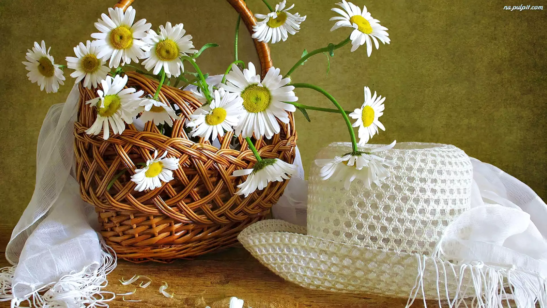 Kosz, Kapelusz, Szal, Białe, Wiklinowy, Margarytki Na Pulpit