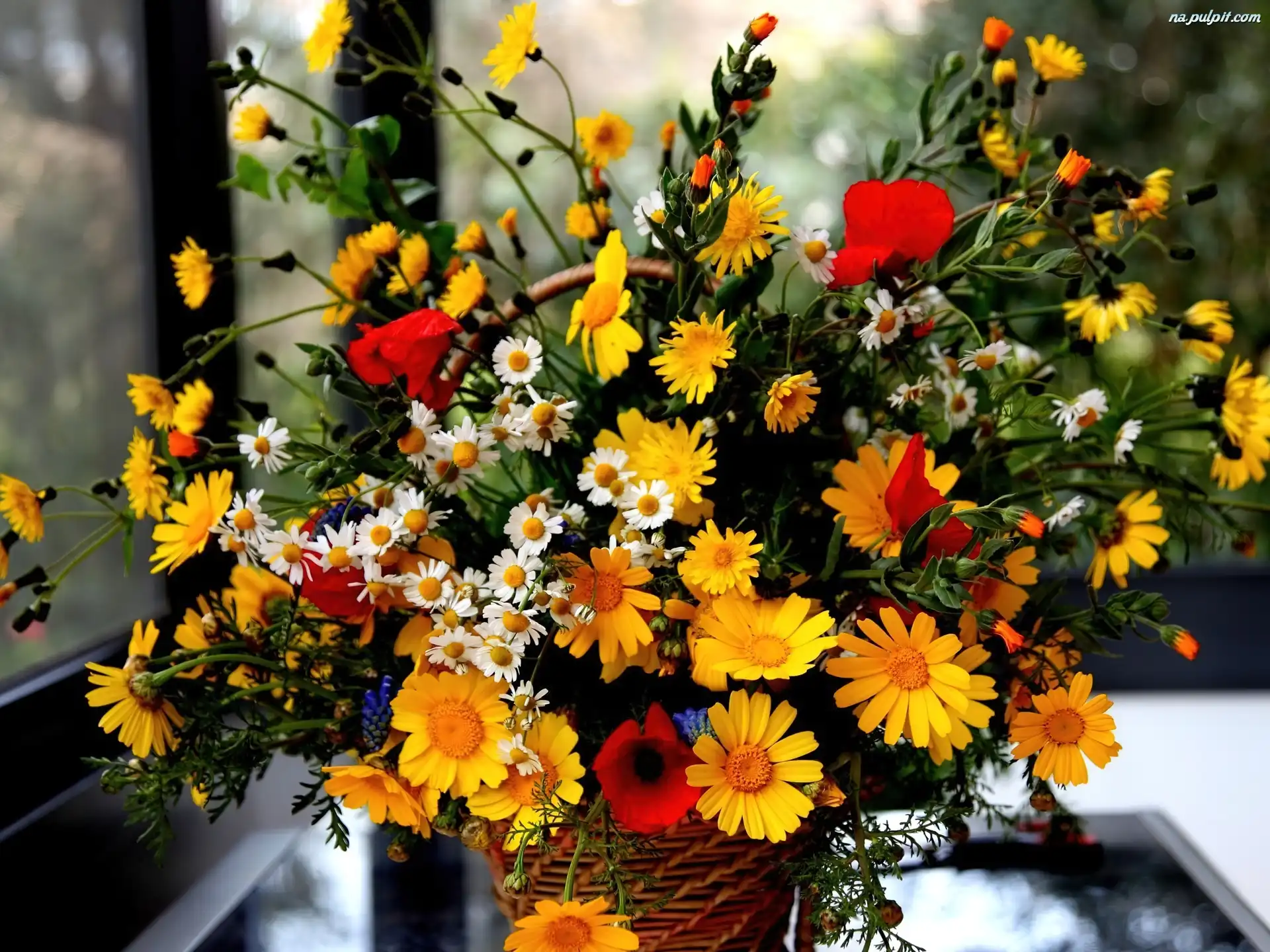 Koszyk, Kwiatów, Polnych, Bukiet, Wiklinowy Na Pulpit