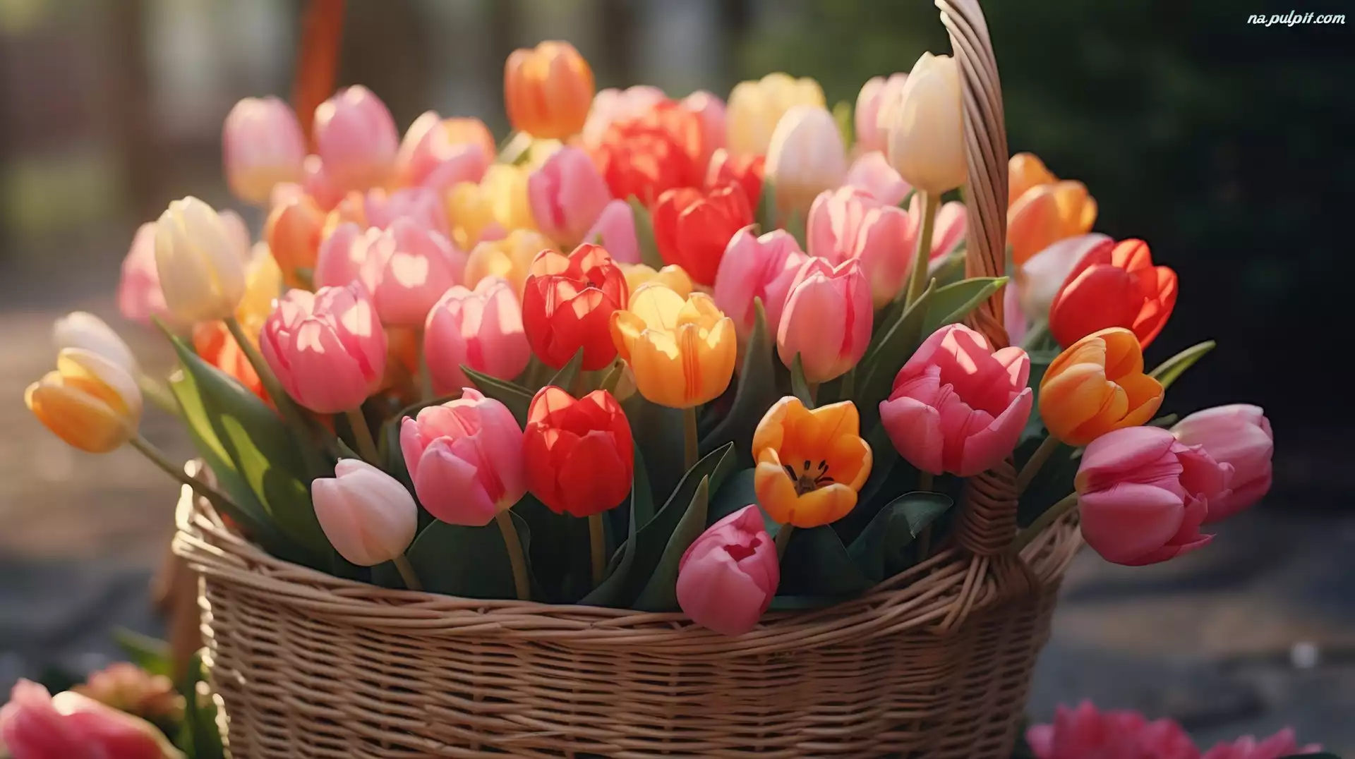 Bukiet, Kolorowe, Tulipany, Koszyk