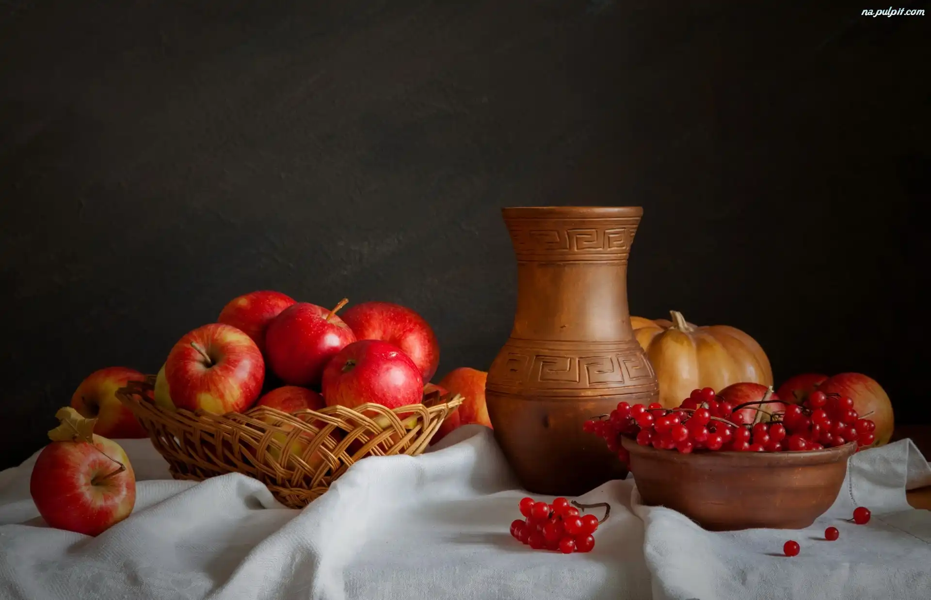 Kompozycja, Koszyk, Dynia, Porzeczki, Miska, Jabłka, Wazon Na Pulpit