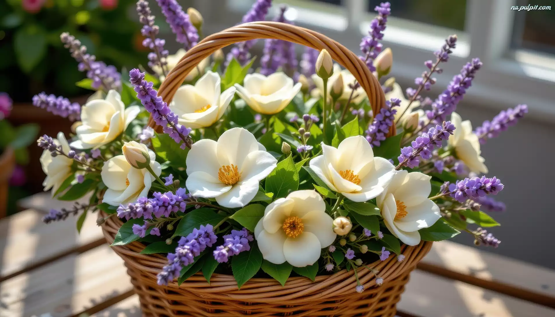 Kwiaty, Kremowe, Fioletowe, Koszyk Na Pulpit