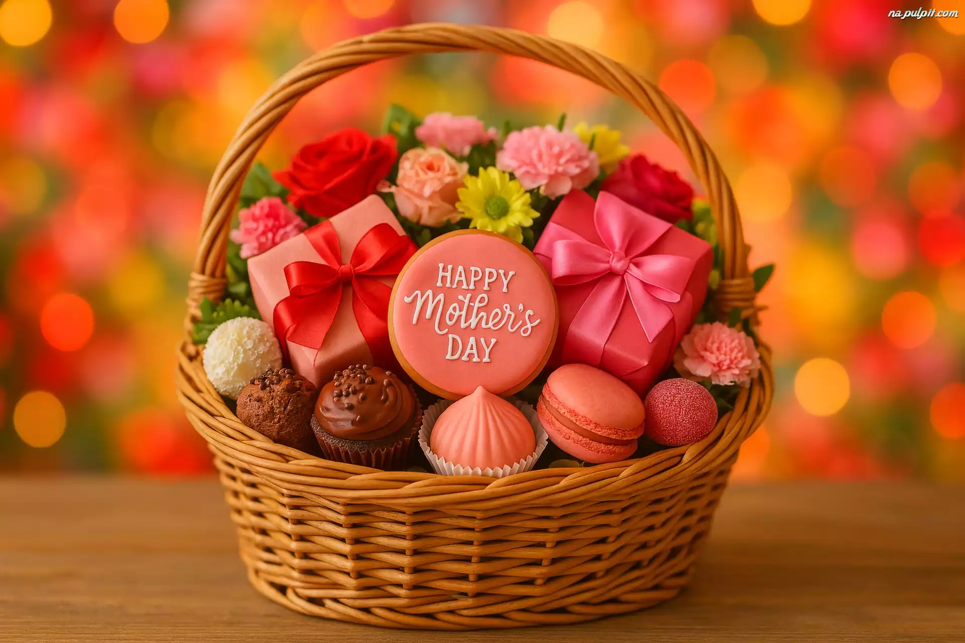 Prezenty, Dzień Matki, Koszyk, Napis, Kwiaty
