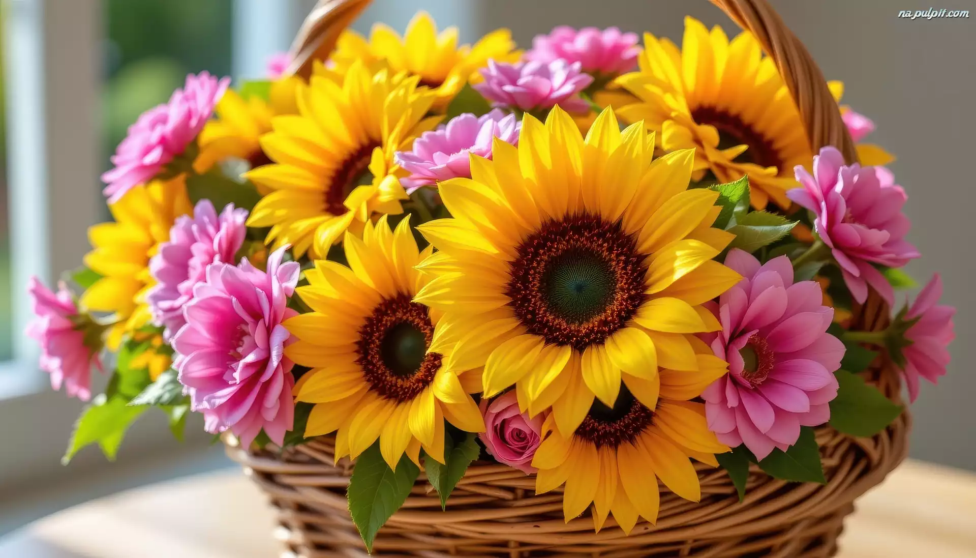 Kwiaty, Różowe, Słoneczniki, Koszyk Na Pulpit