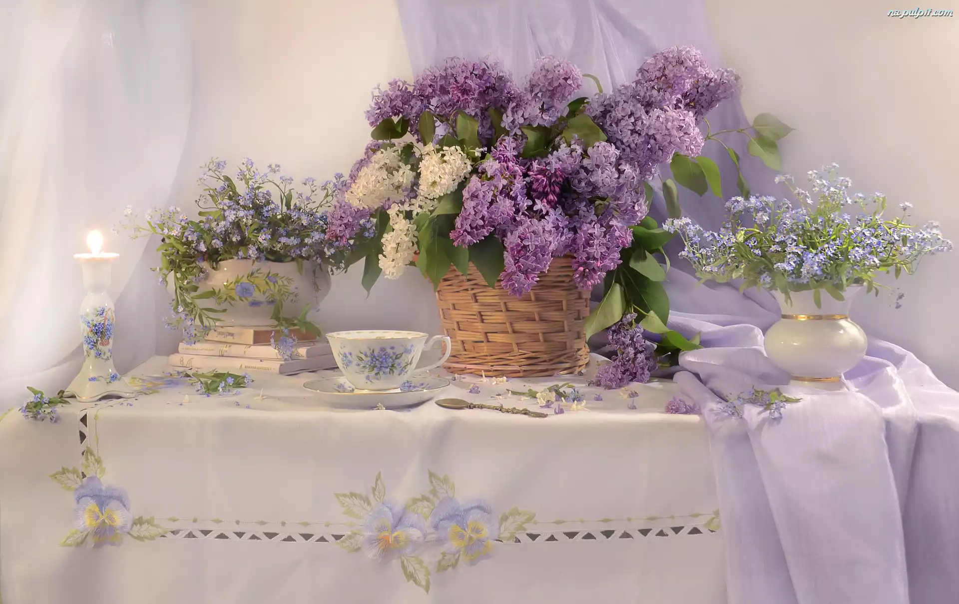 Filiżanka, Bez, Niezapominajki, Bukiet, Świecznik, Kompozycja, Wazon, Kwiaty, Koszyk