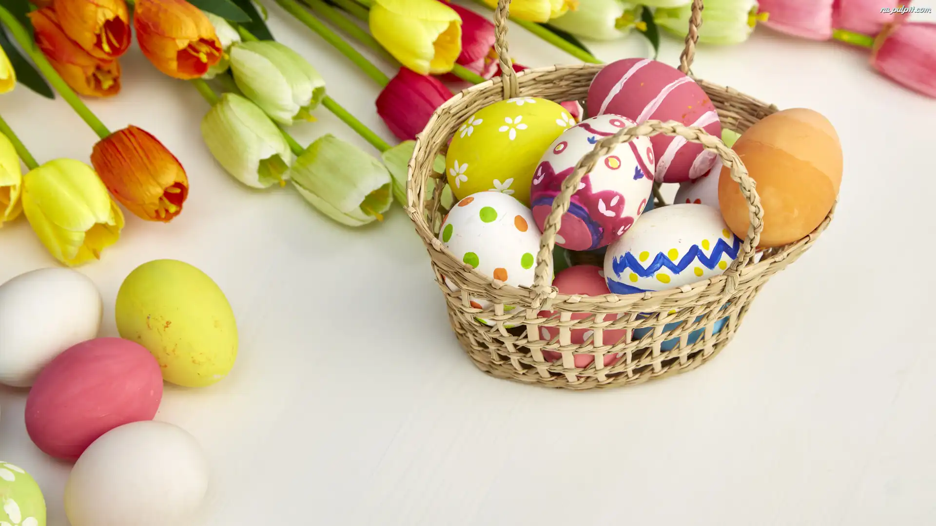 Koszyk, Kwiaty, Tulipany, Kolorowe, Wielkanoc, Pisanki Na Pulpit