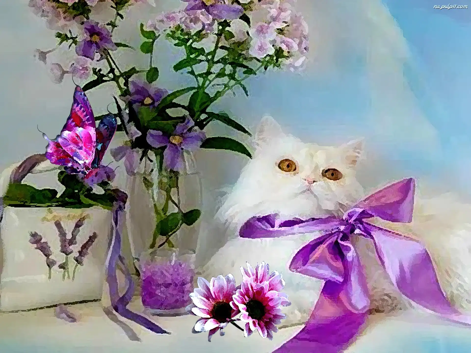 Kot, Kwiaty, Obraz, Fioletowa, Biały, Kokarda Na Pulpit