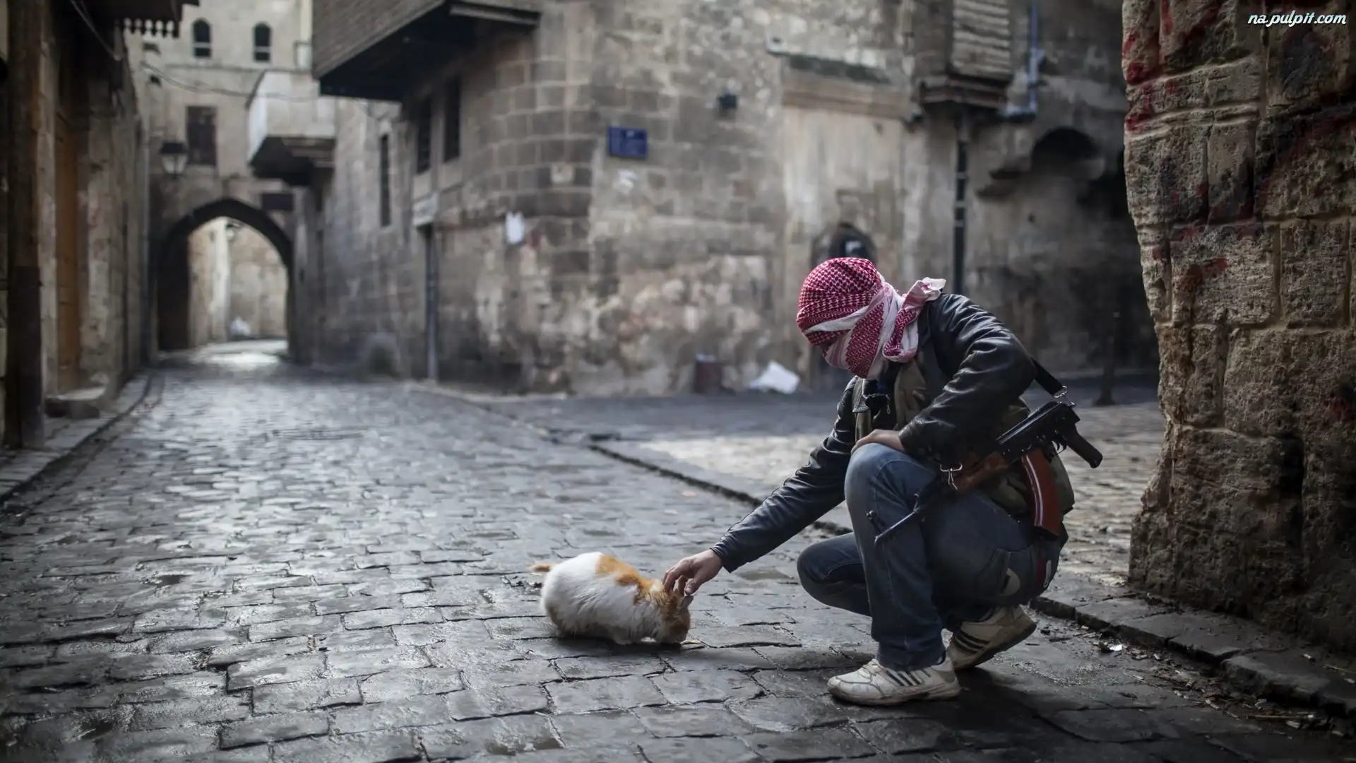Kot, Mężczyzna, Uliczka, Budynki, Karabin
