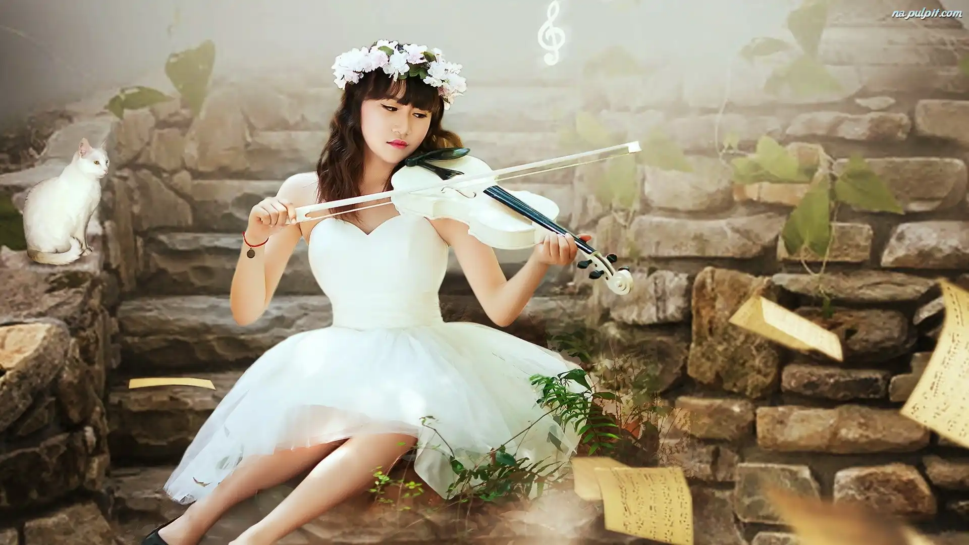 Kot, Skrzypce, Sukienka, Kobieta, Mur Na Pulpit