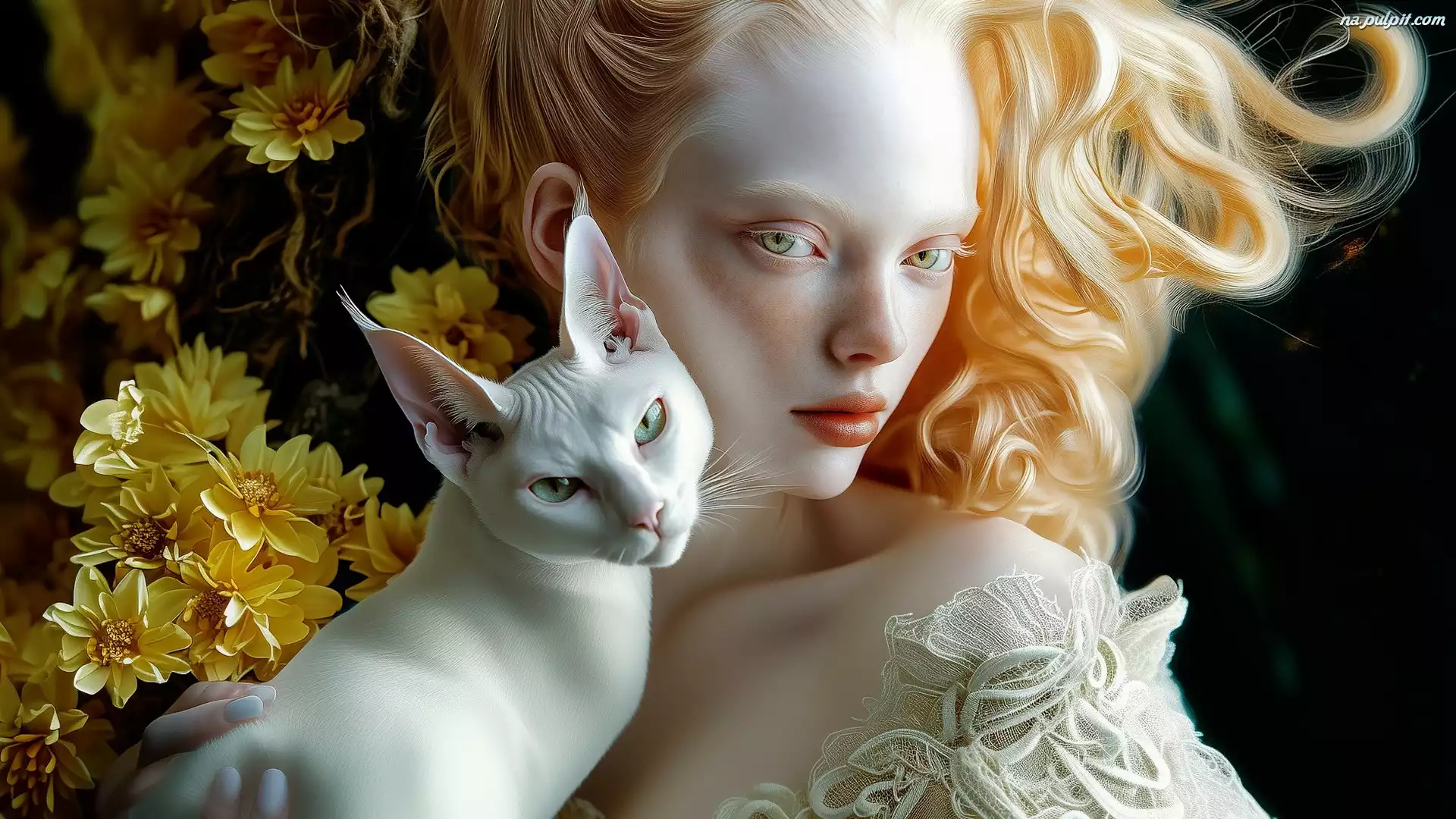 Żółte, Dziewczyna, Biały, Kot, Albinoska, Kwiaty Na Pulpit