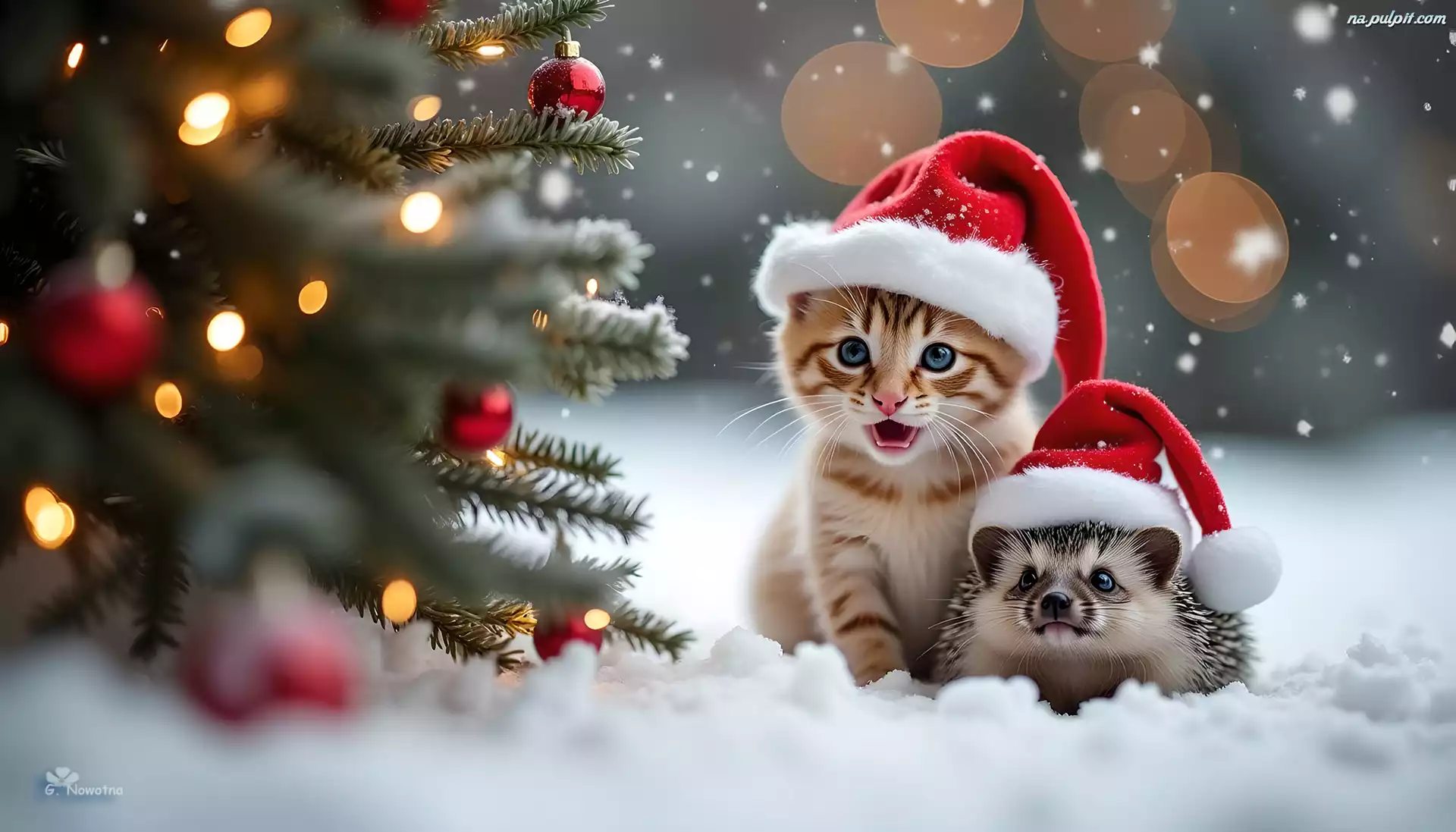 Grafika, Choinka, Mikołaja, Kot, Jeż, Czapki, Śnieg Na Pulpit