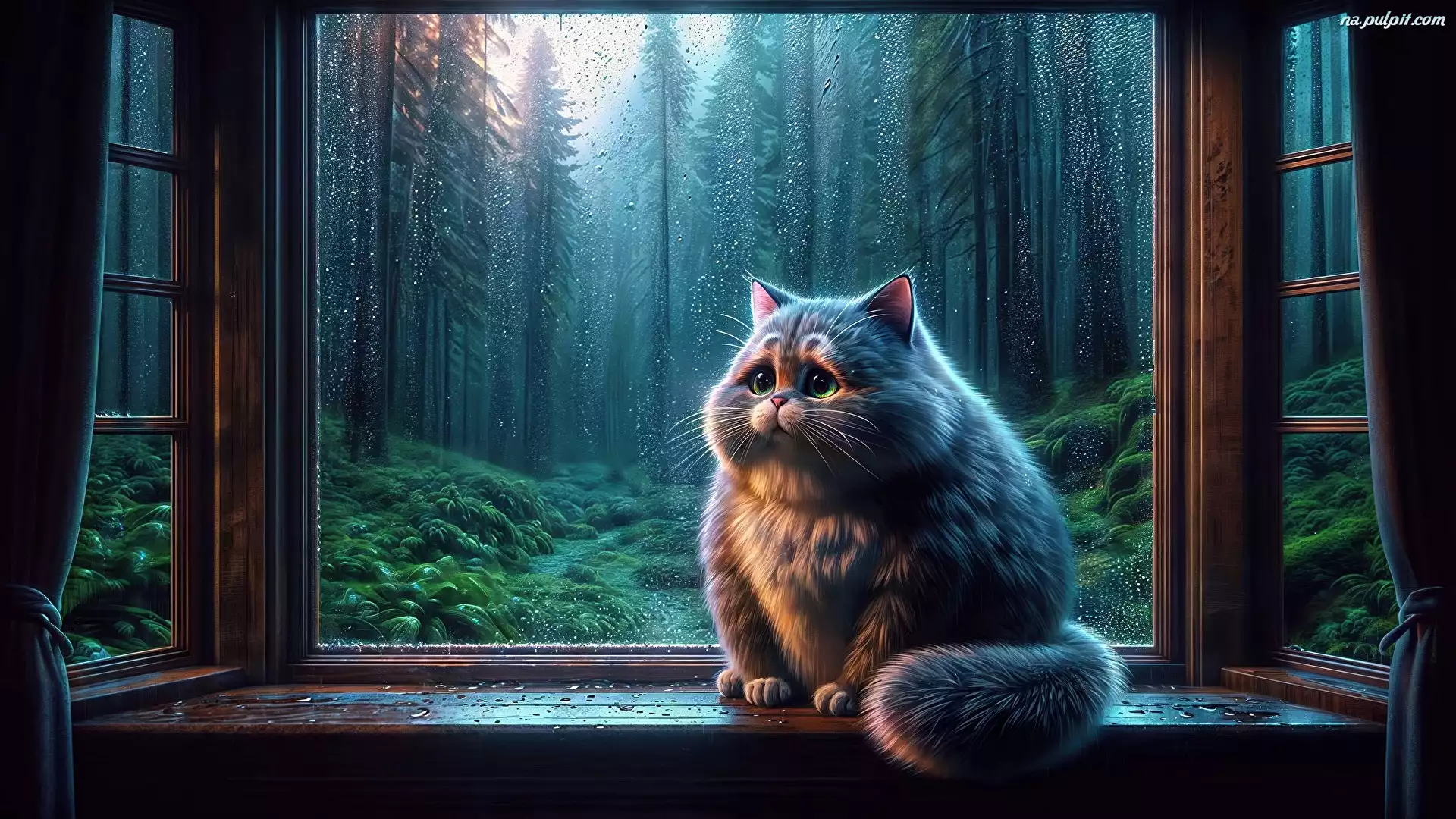 Grafika, Deszcz, Okno, Kot, Puszysty, Smutny, Drzewa Na Pulpit