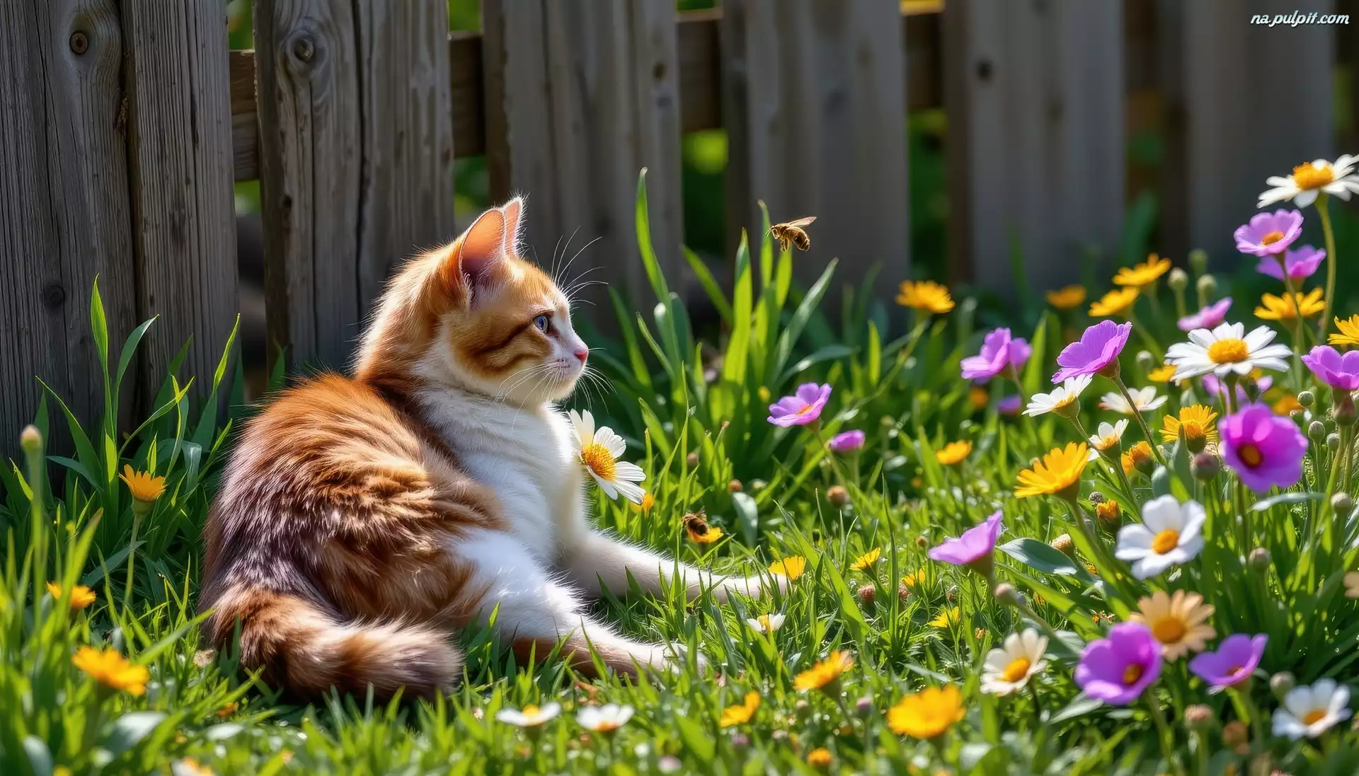 Kwiaty, Biało-rudy, Kot, Płot, Pszczoła