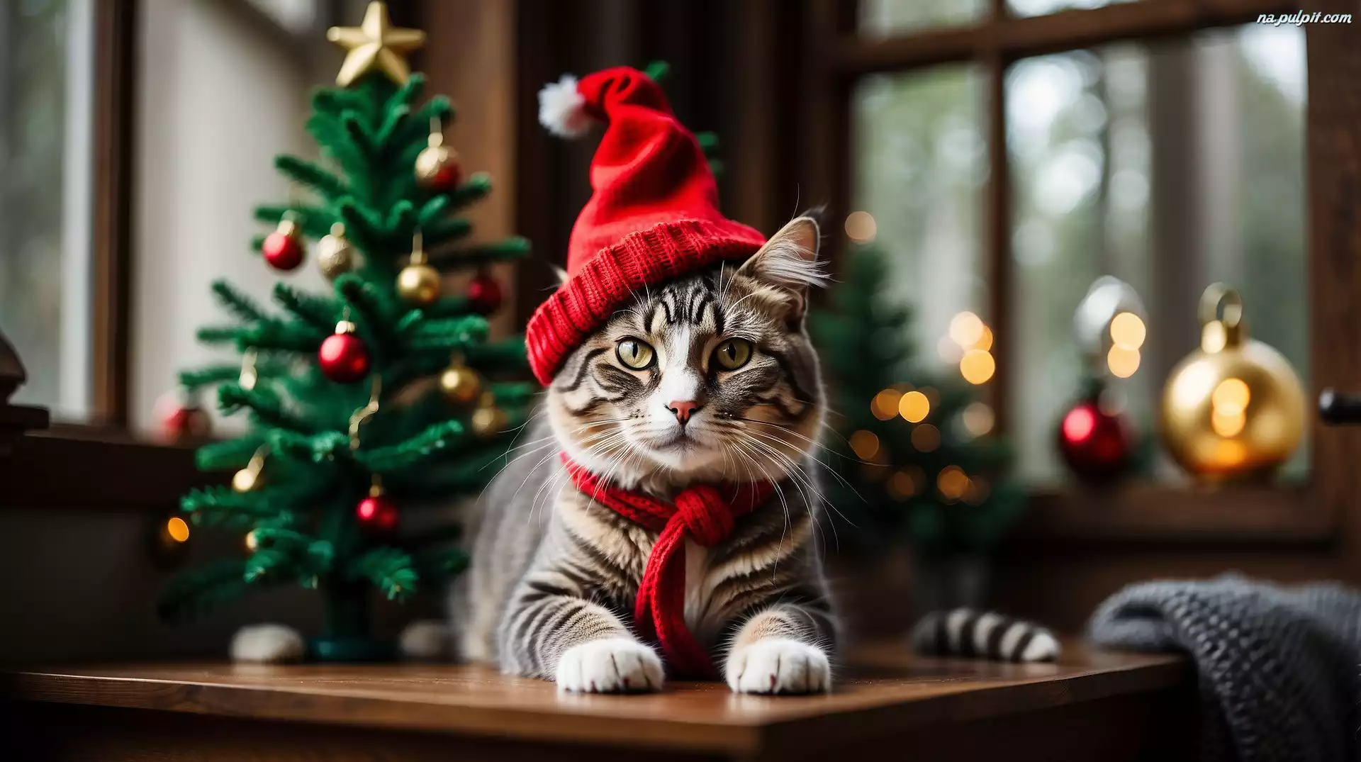 AI, Stół, Szalik, Kot, Czerwona, Czapka, Choinka Na Pulpit