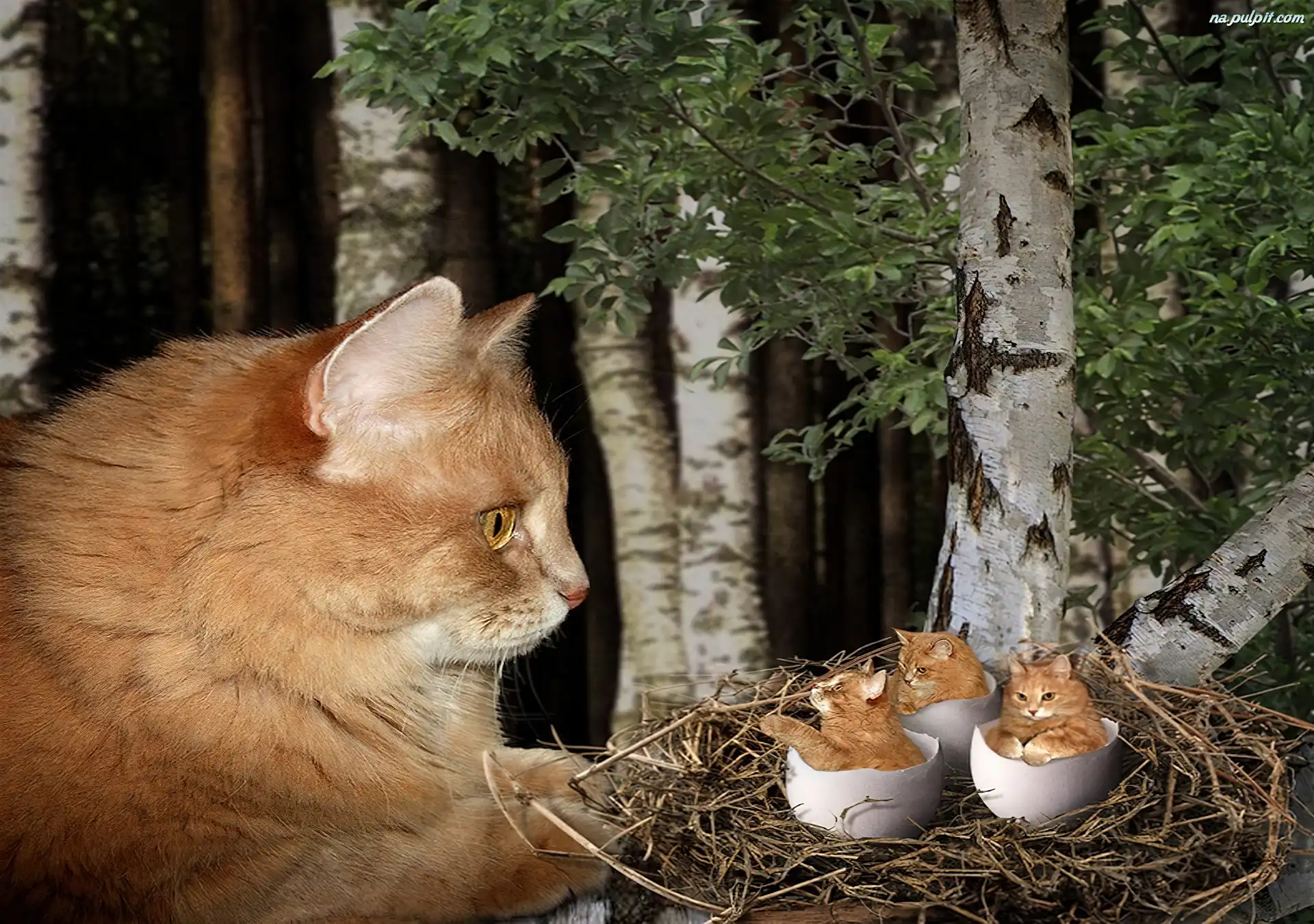 Kotki, Jaj, Drzewa, Gniazdo, Kot, Skorupki Na Pulpit