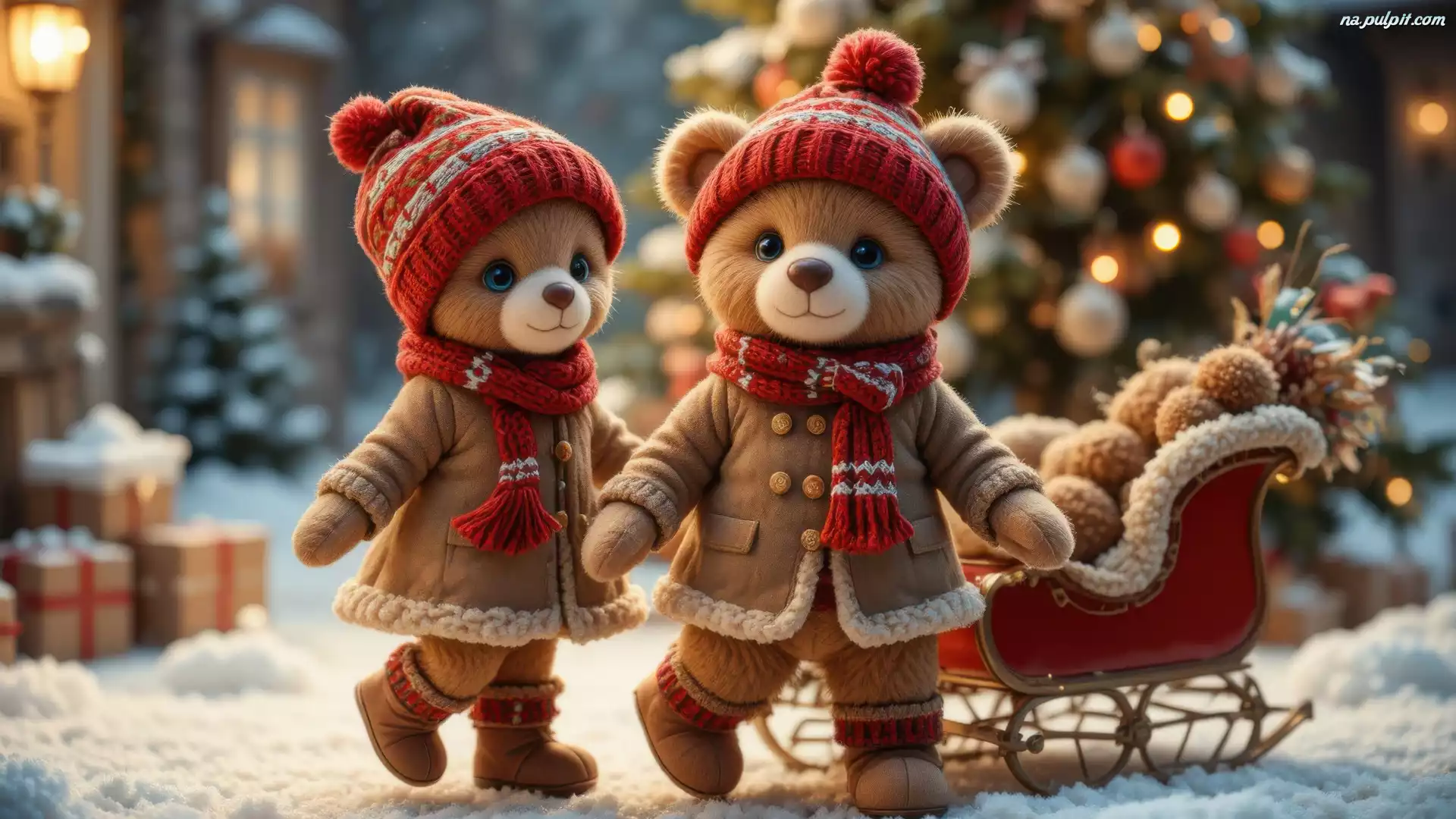 Sanki, Dwa, Czapki, Kożuszki, Misie, Choinka Na Pulpit