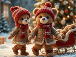 Sanki, Dwa, Czapki, Kożuszki, Misie, Choinka