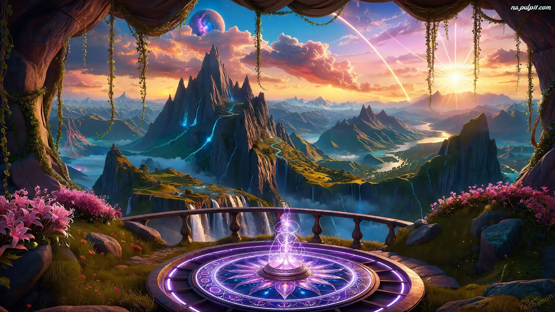 Krąg, Jaskinia, Światło, Grafika, Promienie słońca, Kwiaty, Góry, Skały Na Pulpit
