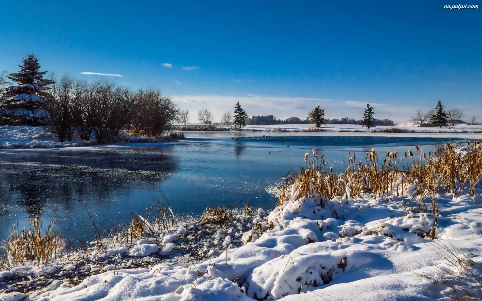 Krajobraz, Drzewa, Kaczki, Rzeka, Zimowy Na Pulpit