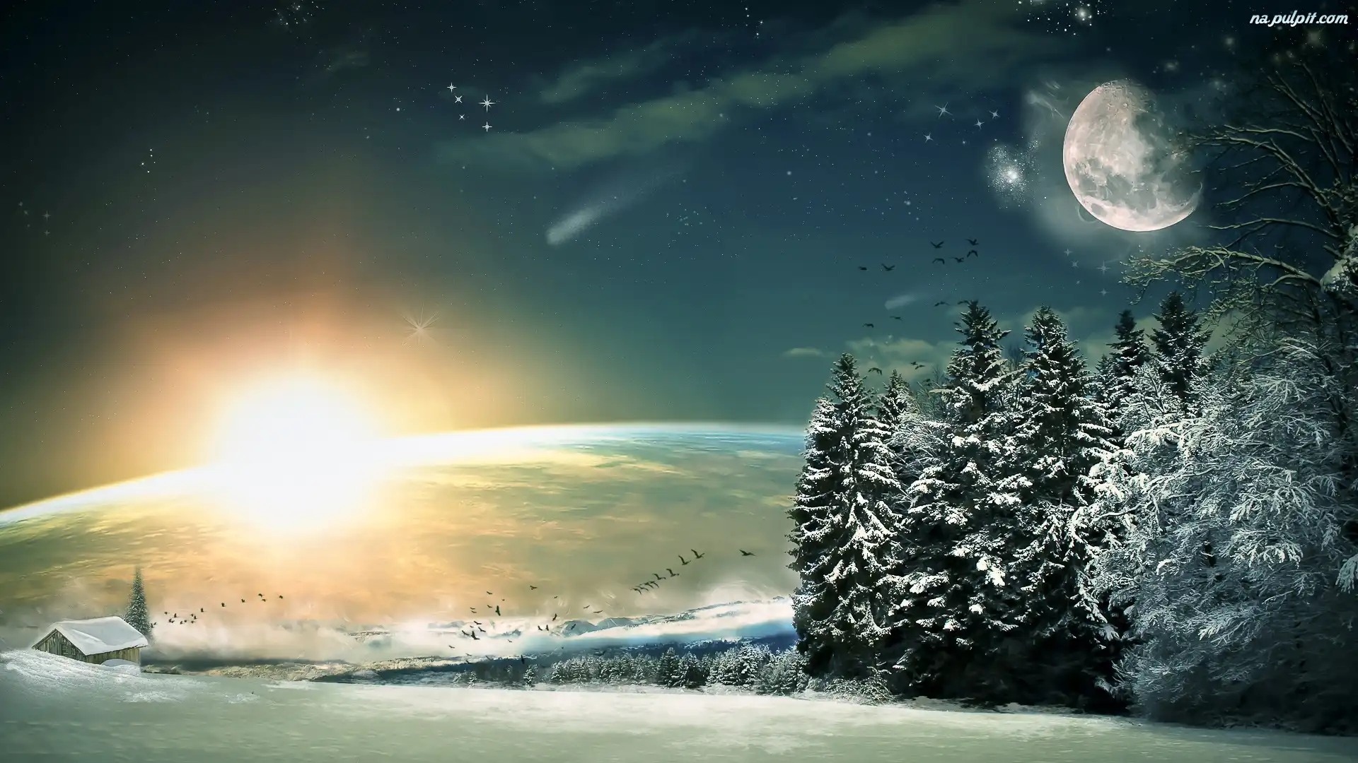 Krajobraz, Księżyc, Słońce, Wschodzące, Zimowy Na Pulpit