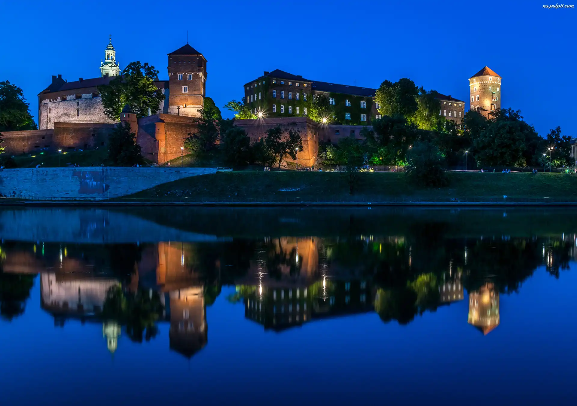 Rzeka Wisła, Kraków, Wawel, Noc, Polska, Zamek Królewski na Wawelu, Zabytek Na Pulpit