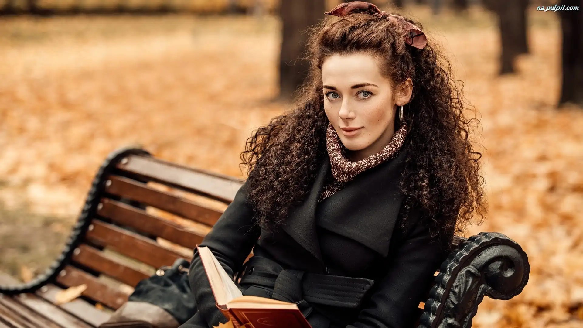 Kręcone, Płaszcz, Ławka, Włosy, Dziewczyna, Czarny Na Pulpit