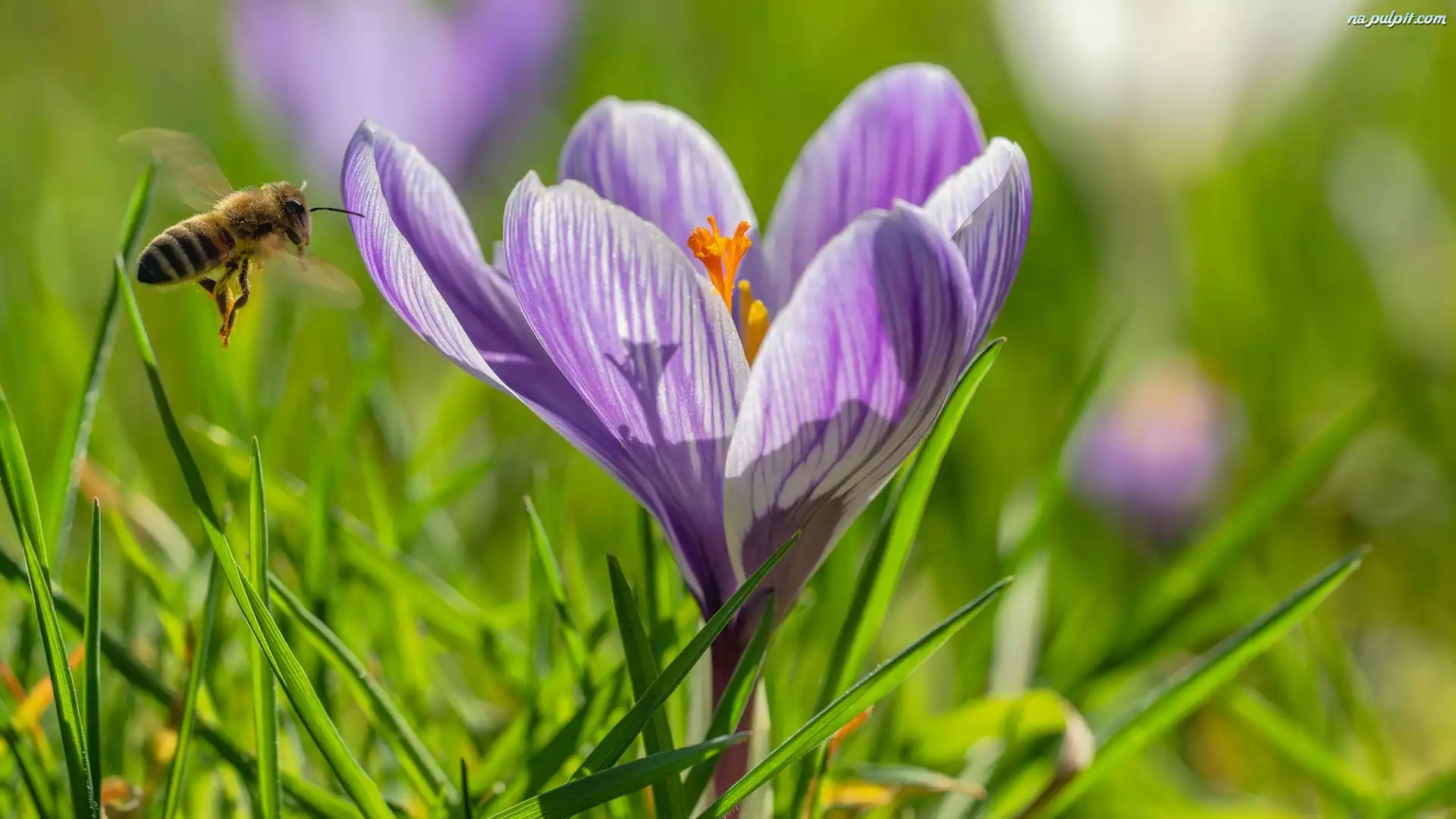 Trawa, Krokus, Fioletowy, Pszczoła, Zbliżenie Na Pulpit