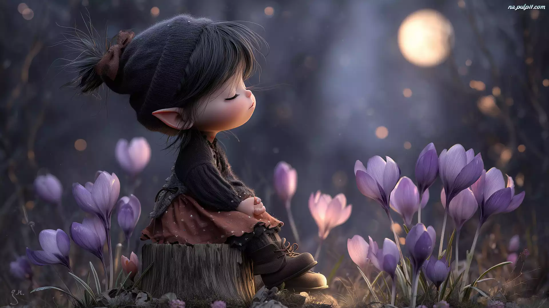 Grafika AI, Elfka, Krokusy, Noc, Pień, Fantasy Na Pulpit
