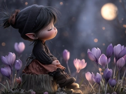 Grafika AI, Elfka, Krokusy, Noc, Pień, Fantasy