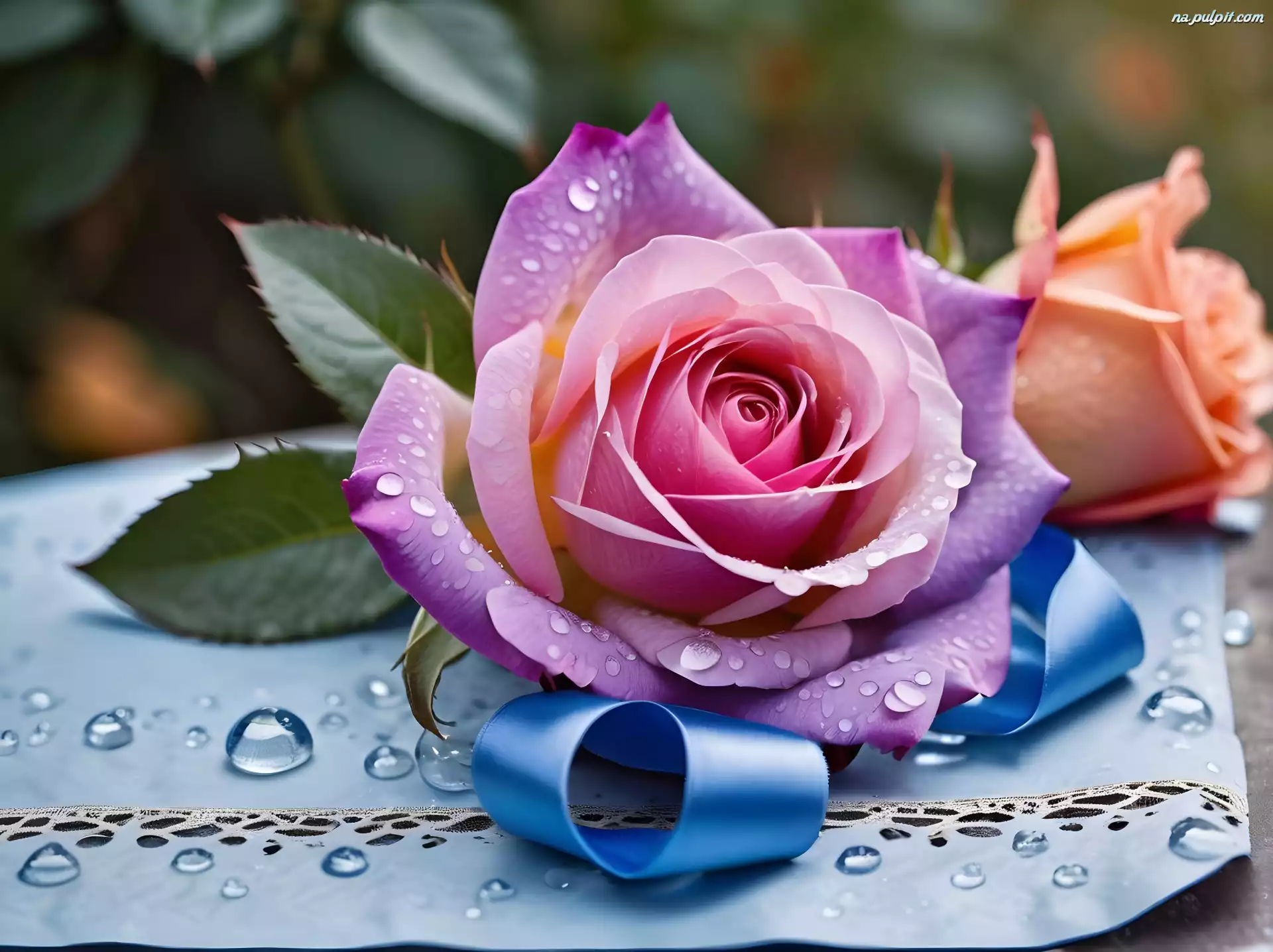 Wstążka, Purpurowa, Kwiat, Krople, Róża, Grafika Na Pulpit