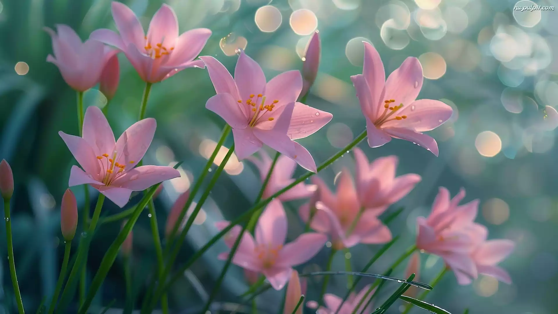 Różowe, Rozwinięte, Kwiaty, Krople Na Pulpit