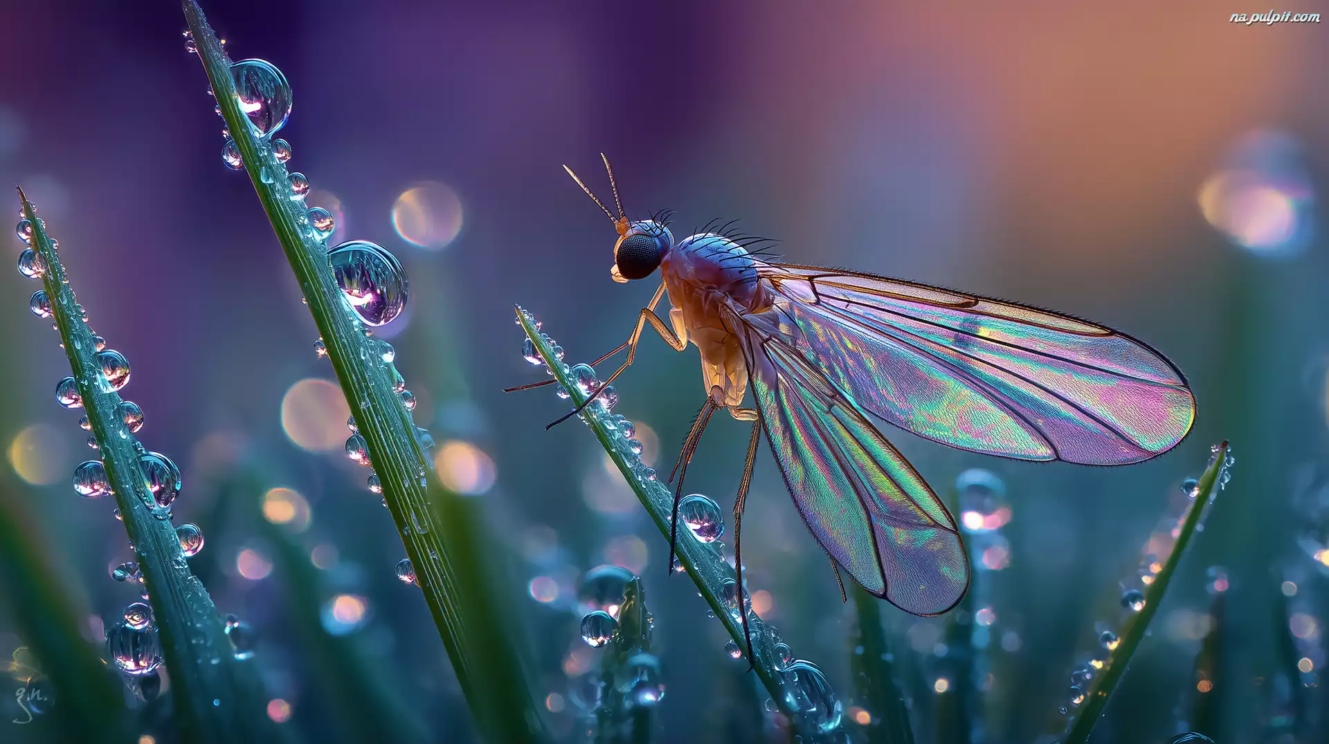 Makro, Owad, Trawa, Krople, Źdźbła, Grafika AI Na Pulpit