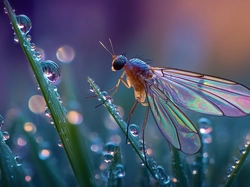 Makro, Owad, Trawa, Krople, Źdźbła, Grafika AI